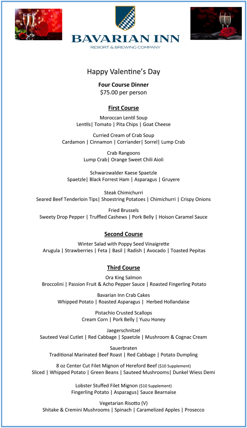 NOTE: Starting January 5th, The Bavarian Inn Resort & Brewing Company will be closed on Mondays and Tuesdays during the month of January. We will re-open each week on Wednesdays for lunch at 11:30am. Guests staying in the hotel on Sunday Nights will be provided a complimentary grab and go continental breakfast on Monday mornings.